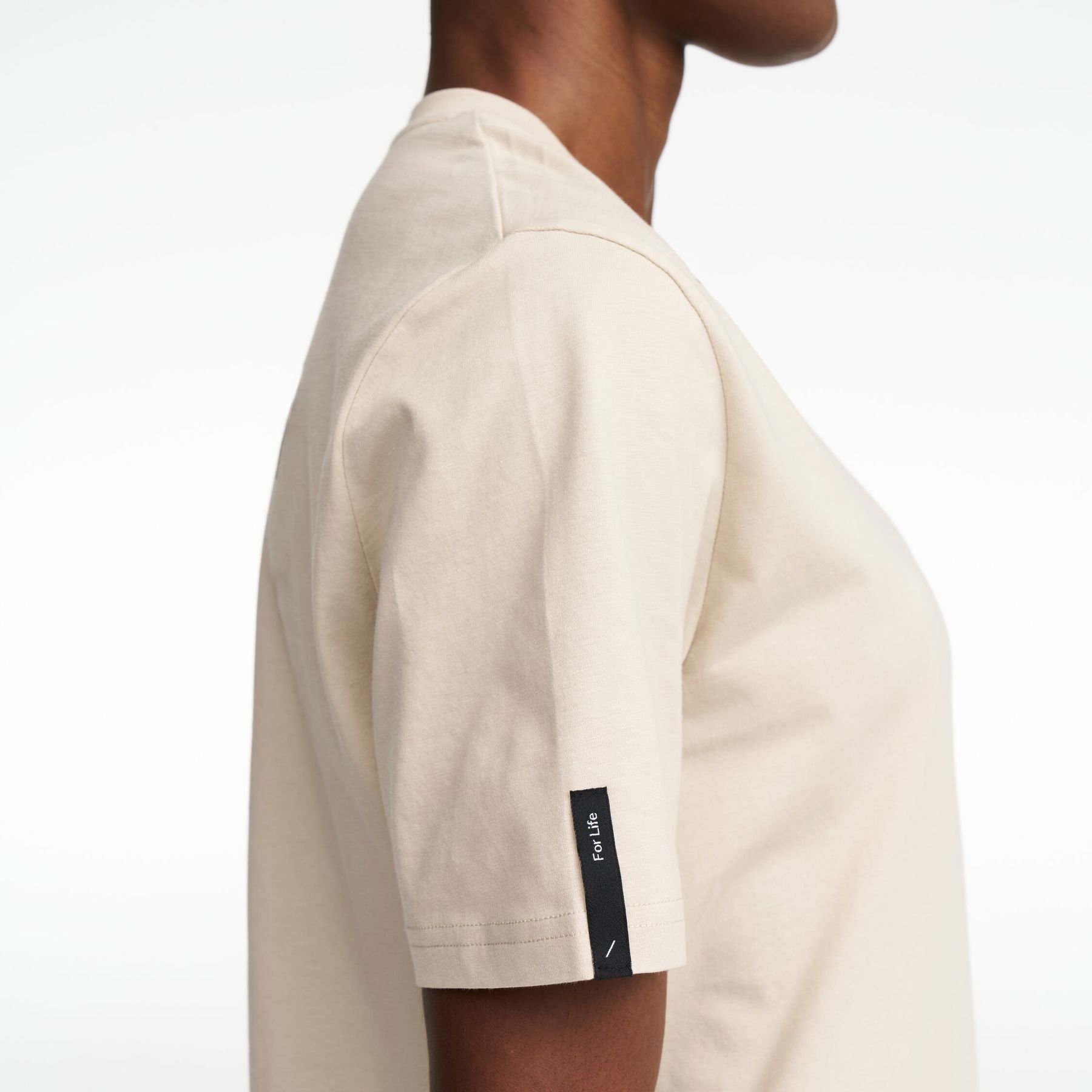 • Corte regular con cuello redondo acanalado